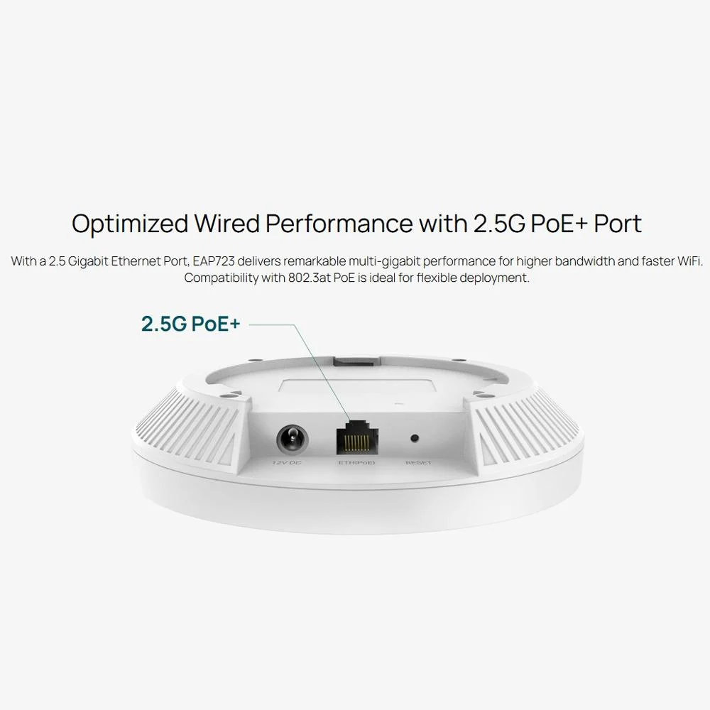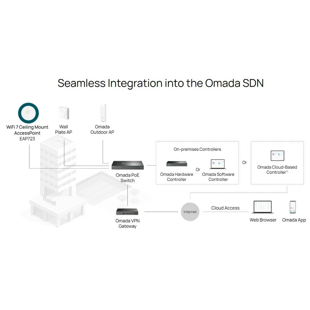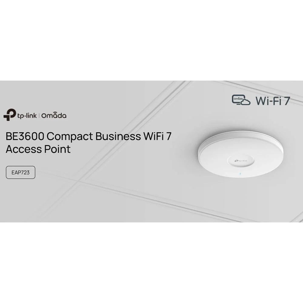 The EAP723 BE3600 delivers next-gen Wi-Fi 7 speed, enterprise-grade security, and Omada SDN intelligence in a sleek, ceiling-mounted design—perfect for high-performance business Wi-Fi.