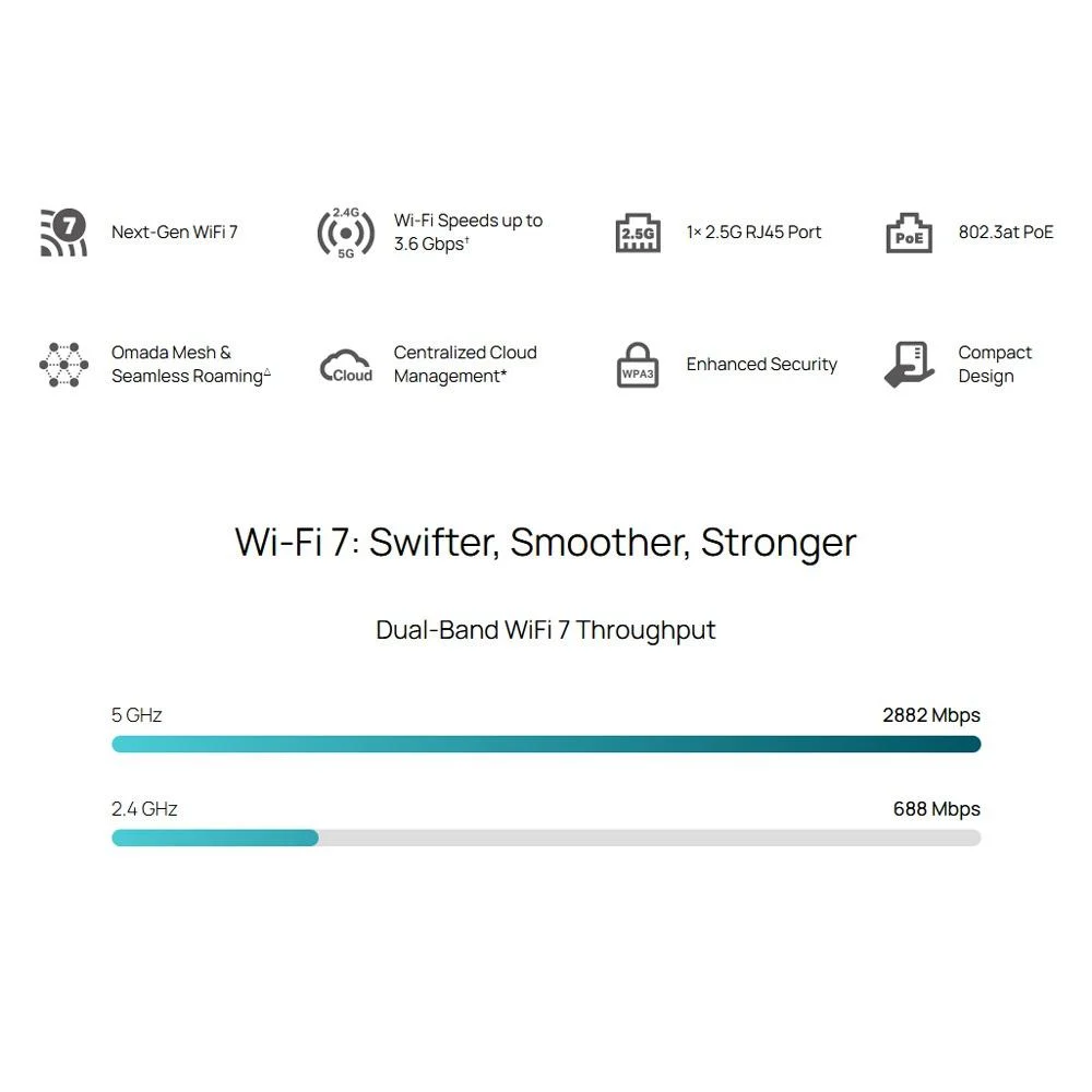 • Wi-Fi 7 Dual-Band (BE3600): 2882 Mbps (5 GHz) + 688 Mbps (2.4 GHz)
